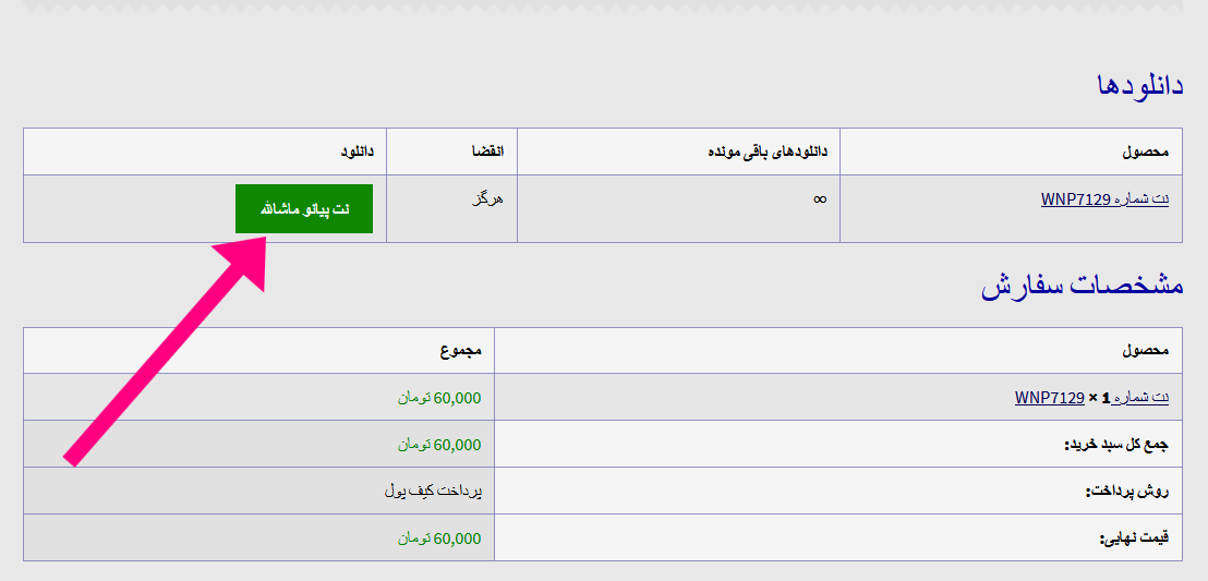 بعد از تکمیل خرید در سایت هارمونی ، صفحه ای مطابق شکل زیر نمایش داده خواهد شد که حاوی لینک دانلود می باشد و با کلیک بر روی لینک مشخص شده میتوانید محصول خریداری شده را دانلود نمایید .