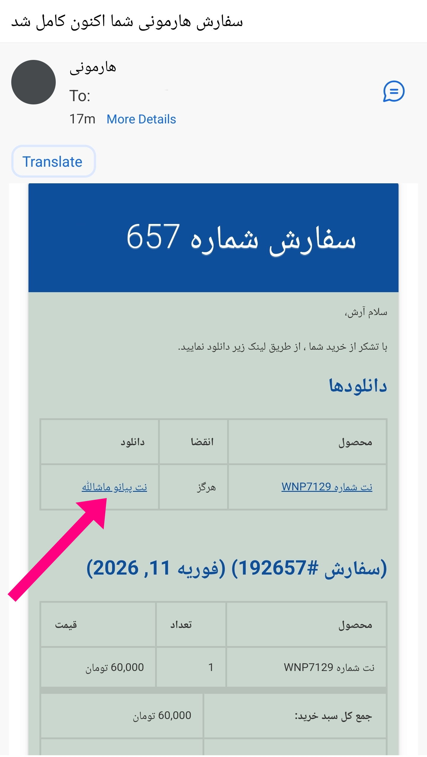 در صورتی که به هر دلیل موفق به دانلود در مرحله قبل نشدید به آدرس ایمیلی که در زمان خرید ثبت کردید مراحعه کنید . لینکهای دانلود حداکثر بعد از نیم ساعت به ایمیل شما ارسال خواهد شد . در نظر داشته باشید اگر در پوشه Inbox ، ایمیلی از طرف سایت هارمونی مشاهده نمی کنید حتما پوشه spam یا junk رو چک کنید.