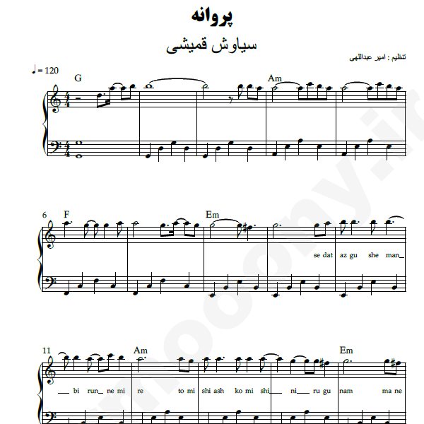 نت پیانو ” پروانه ” –  سیاوش قمیشی